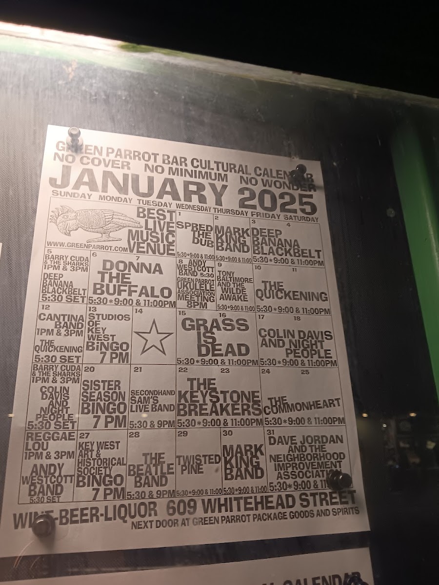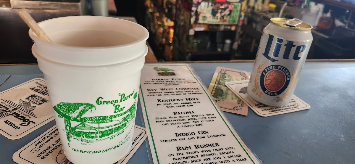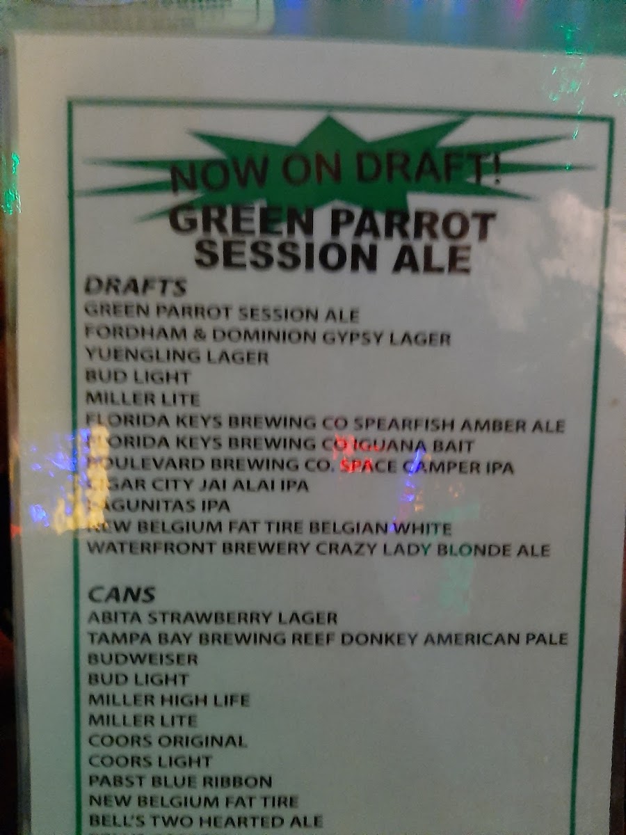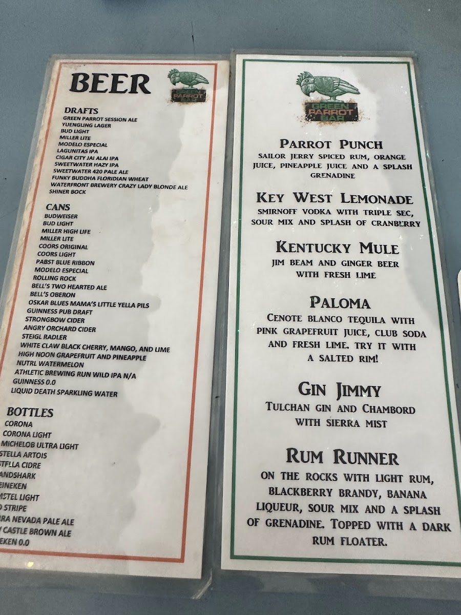 The Green Parrot Bar offers a straightforward menu centered around classic and refreshing beverages, perfect for enjoying during Key West’s lively afternoons and mellow evenings. The selection focuses on cold drafts, canned and bottled beers, alongside a variety of cocktails that complement the bar’s relaxed, island dive atmosphere.